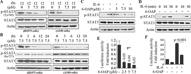 Figure 3: 6-OAP is a STAT3 inhibitor. A. The cells were treated with 6-OAP at indicated concentrations for 12 hours, lysed, and Western blot was performed using indicated antibodies. B. The cells were treated with 6-OAP at 7.5 μM for indicated time points, lysed, and Western blot was performed. C. A549 cells were serum starved for 6 hours, treated with IL-6 at 10 ng/ml for 1 hour, followed by treatment with 6-OAP for 3 hours, lysed, and Western blot was performed. D. A549 cells were pretreated with 6-OAP at 7.5 μM for 3 hours, followed by stimulation with IL-6 at 10 ng/ml for indicated time points. Whole-cell extracts were examined by Western blot. E. Luciferase assays were performed using A549 cells transfected with pAPRE-luc and pRL-CMV (as an internal control), and treated with 6-OAP for 24 hours. F. A549 cells were transfected with pAPRE-luciferase and pRL-CMV, serum starved for 6 hours, and treated with 6-OAP (7.5 μM) or IL-6 (30 ng/ml) for 24 hours, and relative luciferase activities were normalized with the internal control.