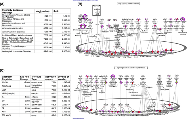 Figure 1. Stromal transcripts are enriched in T-LBL lymphatic relative to T-ALL Bone marrow biopsies. Gene expression datasets were downloaded from the NIH GEO dataset database. Microarray results were analyzed using the Geo2R tool and the resulting transcriptomic data were uploaded into ingenuity IPA. A. The top 10 most enriched Ingenuity canonical pathways in T-LBL biopsies relative to T-ALL bone marrow biopsies are shown. B. Transcripts encoding profibrotic genes are enriched in T-LBL lymphatic biopsies. Shown is the ingenuity Early signaling events in Fibrosis (top) and Signaling events in activated myofibroblasts (bottom). Red depicts transcripts showing ≥ 2-fold increase with a minimum p value of 0.05. The fold change is shown at the bottom and the p value is shown at the top of each transcript. C. Ingenuity upstream regulators enriched in T-LBL lymphatic biopsies are depicted, sorted by highest activation Z-score.