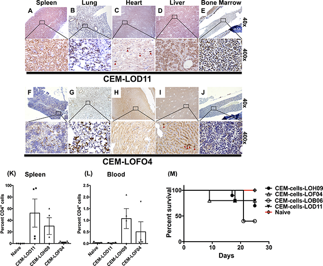 Figure 5. CEM cells co-cultured with lung stromal cells showed altered engraftment and disease induction in SCID mice. One million CEM cells were intravenously injected into SCID mice. The CEM cells were co-cultured with primary human fibroblasts for 21 days prior to isolation and injection into SCID mice. Approximately 25-days post injection, SCID mice were sacrificed and various organs were stained for human CD3 and histologically analyzed. A-J. Representative images from the spleen (A & F), lung (B & G), heart (C & H), liver (D & I) and femurs (E & J) of two groups (n=5) of mice challenged with LOD11- and LOF04-co-cultured CEM cells, respectively showing CEM cell infiltration. K-L. Spleens and blood were collected from CEM-challenged mice and the presence of the injected cells was detected by flow cytometric analysis for human CD4. Average percentage of human CD4+ cells in the spleens (K) and blood (L) is shown from 4-5 mice per group. M. Survival analysis of the mice 25 days post I.V. challenge with CEM cells co-cultured with lung stromal cells.