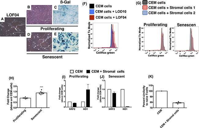 Figure 6. Senescence-induced oxidative stress and impaired antioxidant response account for microsatellite aberrations in CEM-cells co-cultured with lung stromal cells. Primary fibroblasts were passaged 10-25 times until replicative senescence was apparent. A-E. Images of proliferating and non-proliferating stromal cells (B & D respectively) were acquired at 200x magnification and compared to LOF04 stromal cells (A). Depicted is ß-galactosidase activity in non-proliferating (E) relative to proliferating (C) fibroblasts. F. CEM cells were co-cultured with fibroblasts in the presence of the ROS sensor, CellRox green reagent, for 4 h and subsequently analyzed by flow cytometry. Representative histograms indicating ROS-activated CellRox green fluorescence in CEM cells 4 h post co-culture with non-proliferating LOF04 and proliferating LOD10 fibroblasts. G. Representative histograms showing ROS activated CellRox green fluorescence in CEM cells 4 h post co-culture with proliferating (G, left) and non-proliferating (G, right) Stromal cells. H. Fold change in CellRox green GMFI of senescent relative to proliferating fibroblasts (n=5-7) was calculated. ***Unpaired t test; P=0.003 I-J. RNA was extracted from CEM cells after a 21-day co-culture with proliferating (I) or senescent (K) fibroblasts, and subjected to qPCR analysis for NRF2 and HO1. The average fold change in transcript expression in CEM cells co-cultured with 3-4 different human fibroblast lines is depicted. K. Microsatellite sequencing was performed on CEM cells prior to and after co-culture with senescent fibroblasts. Percent similarity of microsatellites in CEM cells co-cultured with senescent fibroblasts compared (n=5) with CEM cells cultured alone is depicted.