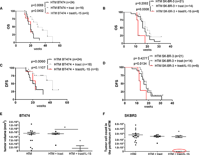 Figure 2: IL-15 immunostimulation influences the outcome of trastuzumab treatment in HTM. Graphs represent the OS and TFS in BT474 (A, C) and SK-BR-3 (B, D) transplanted HTM treated with trastuzumab +/- IL-15. Significance was calculated with the Log-rank (Mantel-Cox) test. (E) Tumor volume of treated and untreated BT474 HTM. Significance was calculated with Tukey’s multiple comparisons test (*=p<0.05). (F) Tumor cell burden was counted in SK-BR-3-transplanted HTM in the peritoneum (ascitis) of the animals. HTM with low or no tumor cell count are marked with a red circle.