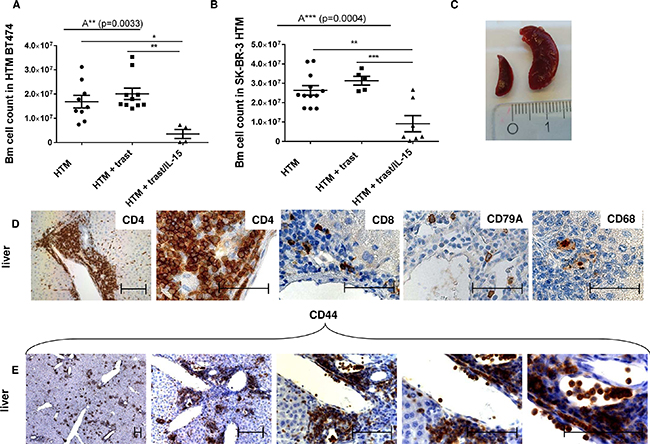 Figure 3: Side effects induced by IL-15 treatment in HTM. Bone marrow (bm) cell counts from femur of BT474 (A) and SK-BR-3 (B) transplanted HTM are illustrated. Significance was calculated using the One-way Anova (A**, A***) and Tukey’s multiple comparison test (*=p<0.05; **=p<0.01; ***=p<0.001). (C) Image of a splenomegalie of an IL-15-treated HTM (right spleen) compared to an untreated HTM (left spleen). (D+E) Immunohistological staining of lymphocyte population in the liver of an IL-15-treated HTM (CD4 = T helper cells; CD8 = cytotoxic T-cells, CD79A = B-cells; CD68 = macrophages; CD44 = activated T-cells). Bars represent 100 μm.