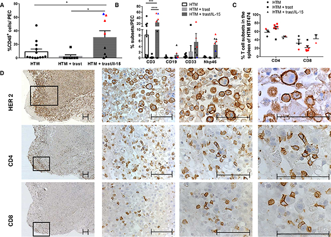 Figure 4: Tumor infiltrating lymphocytes are increased after IL-15 stimulation. Graphs represents the percentage of human leucocytes (%CD45; A) and the immune subpopulations (T-cells (CD3), B-cells (CD19), myeloid cells (CD33), and NK-cells (Nkp46)) in the peritoneal exudate cells (PEC; A, B). Red symbols represent HTM without and blue symbols represent HTM with few remaining tumor cells in the peritoneum. Significance (*=p<0.05; ***=p<0.001; ****=p<0.0001) was calculated using Tukey’s multiple comparison test (A) and Bonferoni’s multiple comparison test (B+C) and values were included in the graphs when p was below 0.5. (C) Graphs summarize CD4 and CD8 distribution in the spleen of BT474 HTM. Red symbols represent HTM without detectable tumors at the end of the experiments. (D) Immunohistological staining of HER2, CD4 and CD8 in a tumor sample of SK-BR-3-transplanted and IL-15-treated HTM. Bars represent 100 μm.