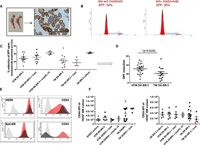Figure 5: Trastuzumab resistance in ex vivo expanded DTC from the bone marrow is associated with increased CD44 expression in SK-BR-3-transplanted NSG. (A) SK-BR-3-expanded DTC cell cultures extracted from femur and tibia (stained with anti-HER2; scale bar represents 100 μm) were incubated in the presence or absence of trastuzumab for 48 hours. The S-phase fraction (SPF, grey) of treated and untreated cultures did not significantly differ and is presented in Figure 5 (B) (30% vs. 32%). A collection of all data is illustrated in Figure 5 (C) and summarized for HTM and TM (independent of treatment) in (D, E) Exemplary histograms of HER2, CD24, EpCAM, and CD44 expression of the isotype (grey), SK-BR-3 cell culture (black) and one trastuzumab insensitive bone marrow (bm) culture (red) are shown. (F) Mean fluorescence intensity (MFI) of CD44 and CD24 expression in HER2+ tumor cells from ex-vivo expanded bm cultures are illustrated in the graphs. Symbols related to trastuzumab insensitive animals who were also analyzed for CD44 & CD24 expression, are displayed in red (C&E). Resistant cells without corresponding CD44/CD24 data are marked in blue. No significant differences were detectable in C & F using Tukey’s multiple comparison test. Statistical differences were calculated using the two-tailed unpaired t test in D (p = 0.0329).