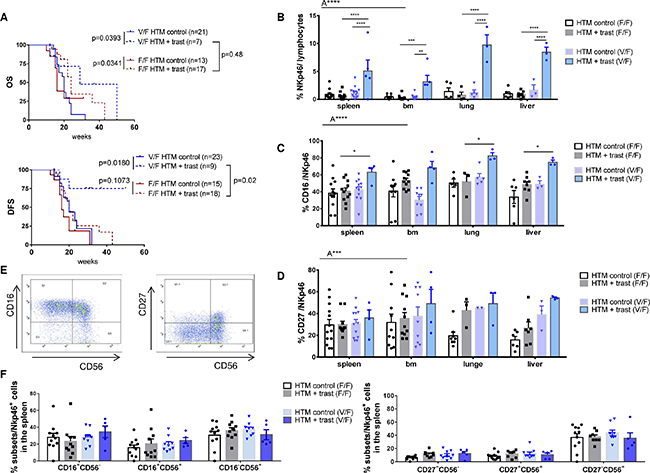 Figure 6: Influence of the FcgRIIIA genotype on NK-cell population and the overall outcome in trastuzumab-treated HTM. (A) Illustration of OS and DFS of BT474 and SK-BR-3-transplanted HTM dependent on the hetero (V/F) or homozygous (F/F) low affinity FcgRIIIA genotype. Numbers of analyzed animals are indicated in brackets. Significance was calculated using the Log-rank (Mantel-Cox) test. Flow cytometric analyses of the overall percentage (B) and the percentage of CD16 expression (C) of NK-cells (Nkp46+) in the spleen, bone marrow (bm), lung and liver of treated and untreated HTM. Exemplary density plots of Nkp46 sub population expression CD16, CD56, and CD27 are shown in (D) and are summarized for all animals in (E & F) Differences were calculated using one-way (F) and two-way Anova (A**** = p <0.0001, A*** = p <0.001) and Tukey’s multiple comparison test (* *= p <0.01; *** = p <0.001; **** = p <0.0001; B, C, D) and values were included in the graphs when p was below 0.5. Bars represent the mean +/- SEM and each symbol represents one single animal.