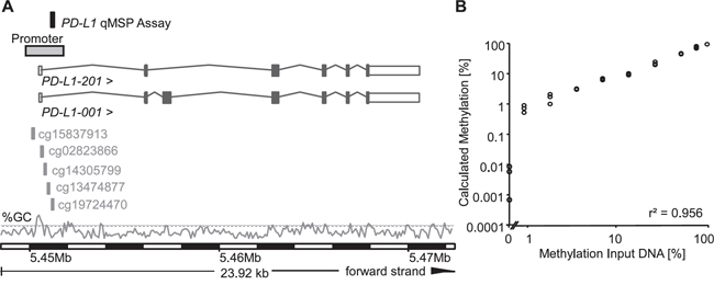 Figure 1: Genomic location, design, and validation of the PD-L1 qPCR assay. A. The PD-L1 qMSP assay was located on the forward strand of chromosome 9. Both PD-L1 spice variants PD-L1-001 and -201 are shown. The five cg-beads from the Illumina Infinium HumanMethylation450 BeadChip (cg15837913, cg02823866, cg14305799, cg13474877, and cg19724470) used for PD-L1 methylation in the TCGA dataset are indicated. Information is based on Ensembl Homo sapiens version 82.37 (GRCh37.p3). The GC content [%] is shown with the dashed line indicating 50% GC. B. The quantitative real-time PCR assay was validated on a dilution series of bisulfite-converted artificially methylated and unmethylated DNA using the PD-L1/ACTB qMSP assay. Each sample was measured in triplicate.