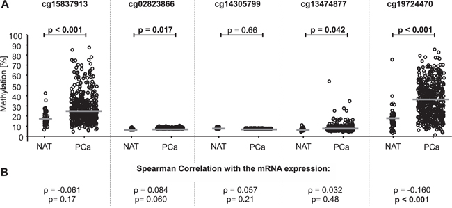 Figure 2: PD-L1 DNA methylation in normal adjacent tissue (NAT) compared to prostate cancer (PCa) tissue and correlation of PD-L1 methylation with mRNA expression in the training cohort. A. Data for five beads from the Illumina Infinium HumanMethylation450 BeadChip located in the PD-L1 gene. The median methylation is indicated by the grey line. P-values refer to Kruskal-Wallis test. PD-L1 DNA methylation was shown to be significantly higher in PCa tissue compared to NAT in four out of five beads (cg15837913, cg02823866, cg13474877, and cg19724470). B. The correlation between mRNA expression and PD-L1 DNA methylation was analyzed by Spearman's rank correlation showing a significant association of PD-L1 methylation and mRNA expression for bead cg19724470.