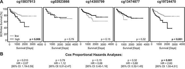 Figure 3: Kaplan-Meier analysis of PD-L1 DNA methylation in prostate cancer patients (training cohort). A. Data for five beads from the Illumina Infinium Human Methylation 450 Bead Chip located in the PD-L1 Gene. Patient samples were stratified into mPD-L1low (grey) and mPD-L1high (black) using an optimized cut-off. Kaplan-Meier analysis of PD-L1 DNA methylation showed a better prognosis for the mPD-L1low subgroup according to the bead pairs cg15837913 and cg19724470. B. Univariate Cox proportional hazard analyses conducted using an optimized cut-off corroborated the prognostic value of mPD-L1.