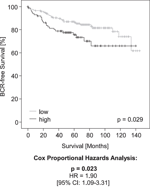 A total of 299 patients with histologically confirmed PCa who had undergone radical prostatectomy at the University Hospital Bonn between 1998 and 2008 were included in the study. BCR-free survival defined as postoperative PSA levels rising above 0.2 ng/ml were determined as the primary endpoint of the study. Clinical follow-up was available for 259 individuals (mean follow-up period 66.4 months, range 1-145 months).