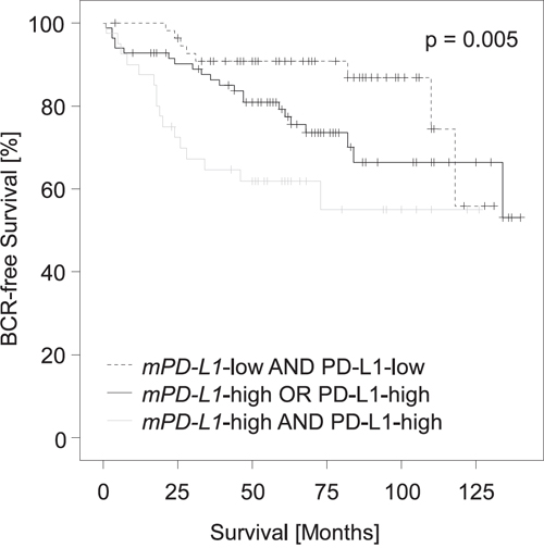 Surprisingly, our study revealed no inverse correlation of PD-L1 promoter methylation and protein expression in PCa. This may point at a complex post-transcriptional and post-translational regulation of PD-L1. According to our findings, mPD-L1 is inversely correlated with mRNA transcription and associated with miR as cellular component, which modify the downstream processing of PD-L1 mRNA. Differential expression of miR may therefore potentially interfere with the linear translation of PD-L1 mRNA into PD-L1 protein. Thus, further studies are warranted to unravel the complex interplay between DNA methylation and protein expression in PCa. In addition, post-translational modifications which affect the stability of the protein (e.g. glycolization) and in turn alter the affinity of the anti-PD-L1 antibody to membranous PD-L1 might further be causative for ostensibly conflicting results [30]. When combining PD-L1 protein expression and methylation, however, both parameters added independent prognostic information, suggesting that PD-L1 methylation might be a valuable companion biomarker in addition to immunohistochemistry. We would therefore strongly recommend the integration of its analysis in running clinical trials.