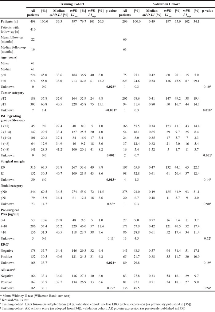 Table 2: Patients’ characteristics and correlation/association of PD-L1 DNA promoter methylation (mPD-L1) with clinicopathological parameters in the training (n = 498, Probe cg19724470) and validation cohort (n = 299). mPD-L1 was dichotomized according to the respective optimized cut-off (mPD-L1low vs. mPD-L1high)