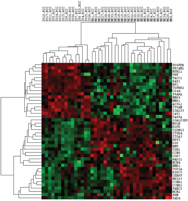 Figure 1: Unsupervised cluster analysis of all the analysed genes and samples. Each column represents a single sample and each row a single gene. IP: reactive mesothelial hyperplasia (MH); ME: Epithelioid mesothelioma (MPM); .RCC: file extension. Red indicates a high level of expression relative to the mean expression, and green indicates a low level of expression relative to the mean expression.