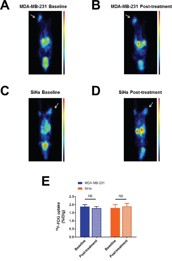 18F-FDG uptake (%ID/g) measured in both tumor models under baseline and post-treatment conditions are presented in Figure 2. In both tumor models, we found that DCA treatment did not lead to a significant change in the uptake of 18F-FDG (Figure 2A-2D), assessing a limited impact of DCA on glucose uptake (Figure 2E). %ID/g measured on PET images (mean ± SEM) were 1.88 ± 0.12 under baseline condition and 1.78 ± 0.11 after treatment for MDA-MB-231 tumors (n=7, P=0.2120) and 1.79 ± 0.21 under baseline condition and 1.89 ± 0.19 after treatment for SiHa tumors (n=7, P=0.0813).