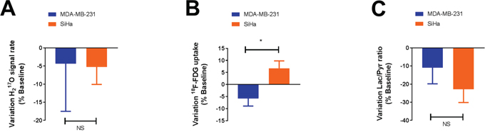 We also evaluated the magnitude of response to the treatment by measuring the variation within the above biomarkers between baseline and post-treatment conditions (Figure 4). No differences in oxygen consumption and lactate flux measurements were observed between MDA-MB-231 and SiHa tumors during the treatment (P>0.05) (Figure 4A, 4C). Only a small but significant difference in behavior was observed for 18F-FDG uptake measurements (P=0.0240) (Figure 4B). MDA-MB-231 tumors decreased their 18F-FDG uptake after treatment (n=7, -5.4 ± 3.5 %) compared to SiHa tumors (n=7, +6.7 ± 3.1 %).