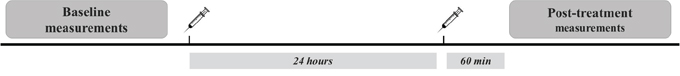 To assess the effects of DCA on tumor metabolism using biomarkers, all animals have undergone imaging before and after treatment, with one day between each measurement. Dichloroacetate sodium (Sigma-Aldrich) was administered intraperitoneally (200 mg/kg) after baseline measurements to the mouse. Another dose was given 24 hours after the first dose injection. Post-treatment measurements were initiated 1 hour after treatment administration. This administration scheme is consistent with previous studies attesting the effects of DCA in tumors using hyperpolarized 13C-MRI [13, 15]. The imaging protocol is summarized in Figure 5.