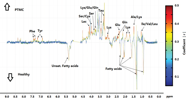 Figure 3: Coefficient-coded loading plots for the models discriminating between PTMC group and healthy groups. Peaks in the positive direction indicate metabolites that are more abundant in the PTMC groups than healthy group (↑PTMC); Peaks in the negative indicate metabolites that are more abundant in the healthy group than PTMC group (↓Healthy).