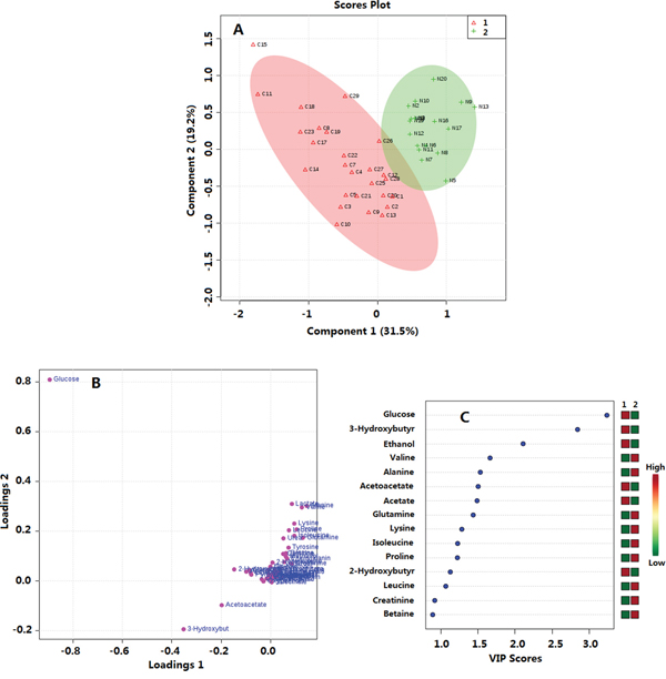 Figure 4: Multivariate data analysis of plasma metabolomics between PTMC and healthy groups. A. PLS-DA score plot; R2 = 0.85, Q2 = 0.81 B. Loadings plot; C. VIP scores. 1. PTMC groups; 2. Healthy groups.