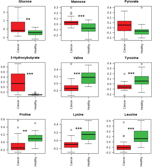 Figure 5: Box plots showing representative metabolite changes between PTMC and healthy groups. **p < 0.01;***p < 0.001.