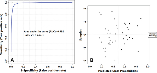 Figure 6: A. Receiver operating characteristic curve showing PLS-DA model ability to predict thyroid tumor malignancy; B. Predicted class plot showing the discrimination between thyroid lesions and their healthy counterpart tissues.