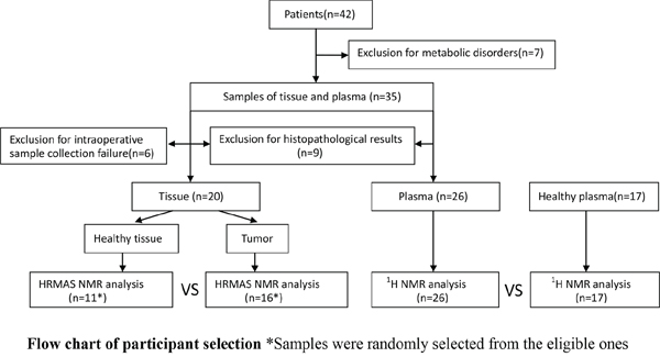 Plasma samples were collected preoperatively from 35 patients and 17 volunteers prior to the morning meal with over 8 hours fasting. No intravenous or intramuscular injections were performed in the past three days. Samples were collected by a registered medical technician using a plasma-collecting tube with heparin as the anticoagulant in Qilu Hospital of Shandong University. Samples were then centrifuged at 3000 rpm for 5 min. Plasma was collected in a sterilized 1.5 mL centrifuge tube. The plasma samples were flash frozen in liquid nitrogen and stored at -80°C until NMR analysis.