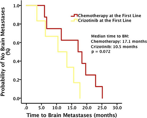 There were several limitations for our current study. On the one hand, as a retrospective study involving patients from one cancer center, bias may have been introduced by the patient cohort. On the other hand, because of the relatively short follow-up time, we could see the trend that time to brain metastases was longer in patients receiving chemotherapy at the first line, compared with patients receiving Crizotinib, but the current result was not significant. Thus, a multicenter prospective study would be required to further confirm our results.