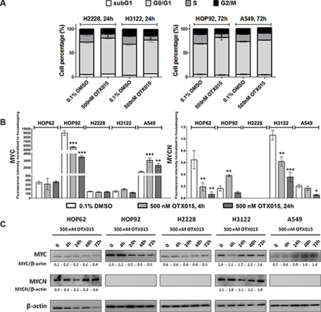 Figure 1: (A) OTX015 induces cell cycle changes in OTX015-sensitive NSCLC cell lines. Effect of 500 nM OTX015 on cell cycle progression after 24 h in H2228 and H3122 and after 72 h in HOP92 and A549 cells, by FACScan, expressed as percent cells per cell cycle phase (*p < 0.05 for G0/G1 cell cycle phase, and #p < 0.05 for S phase). (B) OTX015 modulates MYC and MYCN mRNA levels in sensitive and resistant NSCLC cell lines. Effect of 500 nM OTX015 on MYC and MYCN mRNA levels after 4 and 24 h by qPCR, expressed as fluorescence intensity normalized to housekeeping genes. Results represent the mean ± SD of one representative experiment performed in duplicate (*p < 0.05, **p < 0.01, ***p < 0.001 respect to controls). (C) OTX015 effects on MYC and MYCN protein levels in NSCLC cell lines by Western blot. Cells were exposed to 500 nM OTX015 for up to 72 h. Results are representative of at least two independent experiments. β-actin was used as a loading control and densitometry analysis was done using Image J software.