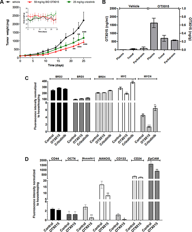 Figure 2: (A) OTX015 in vivo effects in NSLCL-ALK(+) H3122-tumor bearing mice. Antitumor effects of 50 mg/kg OTX015, BID, 7 days ON, gavage or 25 mg/kg crizotinib, thrice weekly, gavage were compared with vehicle thrice weekly, gavage in H3122 murine xenografts (n = 10 mice per group). Asterisks indicate significant differences in tumor mass between each single agent arm versus the vehicle-treated group (*p < 0.05, **p <0.01 and ***p < 0.001). (B) OTX015 concentrations in plasma and tissue from H3122 xenografts. OTX015 levels were evaluated in terminal plasma, peritumoral normal and tumor tissue from H3122-bearing mice treated with 50 mg/kg OTX015 BID or vehicle for 25 days. Mice were sacrificed 4 h after the last administration. Results are expressed as mean ± SD. (C) Gene expression of BRDs and MYC family genes by qPCR in H3122 tumors after treatment with OTX015. Differences in gene expression between OTX015 (50 mg/kg OTX015) and crizotinib (25 mg/kg thrice weekly) with respect to controls were evaluated with one-way Anova followed by Dunnett's Multiple Comparison Test (**p < 0.01 and ***p < 0.001). (D) Gene expression of stem cell markers by qPCR in H3122 tumors after treatment with OTX015. Differences in gene expression between OTX015 and crizotinib with respect to controls were evaluated with one-way Anova followed by Dunnett's Multiple Comparison Test (*p < 0.05 and **p < 0.01).