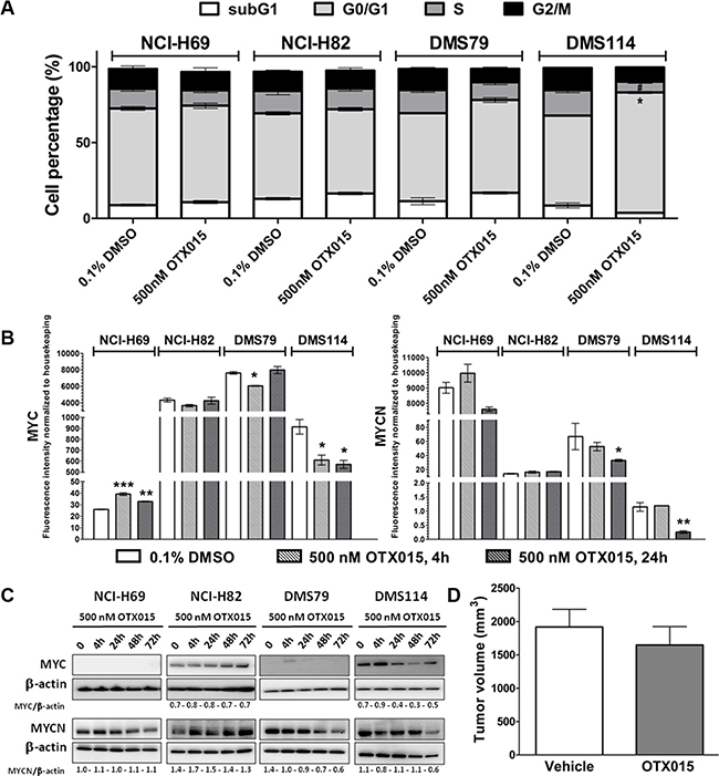 Figure 3: (A) OTX015 induces cell cycle changes in OTX015-sensitive SCLC DMS114 cells. Effect of 500 nM OTX015 on cell cycle progression after 72 h, by FACScan, expressed as percent cells per cell cycle phase (*p < 0.05 for G0/G1 cell cycle phase, and #p < 0.05 for S phase). (B) OTX015 modulates MYC and MYCN mRNA levels in sensitive and resistant SCLC cell lines. Effect of 500 nM OTX015 on MYC and MYCN mRNA levels after 4 and 24 h, by qPCR, expressed as fluorescence intensity normalized to housekeeping genes. Results represent the mean ± SD of one representative experiment performed in duplicate (*p < 0.05, **p < 0.01, ***p < 0.001 respect to controls). (C) OTX015 effects on MYC and MYCN protein levels in SCLC cell lines by Western blot. Cells were exposed to 500 nM OTX015 for up to 72 h. Results are representative of at least two independent experiments. β-actin was used as a loading control and densitometry analysis was done using Image J software. (D) OTX015 in vivo effects on tumor volume in DMS114 murine xenografts. Tumor volume was determined after 28 days of treatment with vehicle or 50 mg/kg OTX015, BID, 7 days ON, gavage (n = 10 mice per group).
