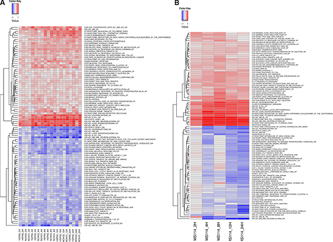 Figure 4: Heatmap of the average gene set expression of the most enriched gene sets among genes changing after exposure to OTX015 in lung cancer OTX015 sensitive cell lines. (A) NSCLC cell lines; (B) SCLC cell line. The top 50 most enriched gene sets among upregulated genes and the top 50 enriched gene sets among downregulated genes are shown. Gene set expression was calculated using GSVA. Y-axis: cell lines at different time points. The heatmap colors are not scaled and show the consistent increase (or decrease) of gene set expression in time. X-axis: top differentially expressed gene sets as assessed by GSEA. Gene sets were filtered for a minimal fold-change of > 0.15 and FDR < 0.05.