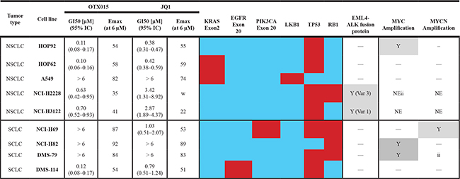 GI50 and Emax (at 6 μM) values for OTX015 and JQ1 after 72h-exposure, by MTT assay. Results represent the mean and 95%CI of at least three independent experiments performed in triplicate. The cell panel was characterized for KRAS, EGFR, PIK3CA, LKB1, TP53, RB1, EML4-ALK fusion protein and MYC and MYCN amplification. Red indicates mutation, blue is wild-type, Y = yes, and NE = not evaluated.