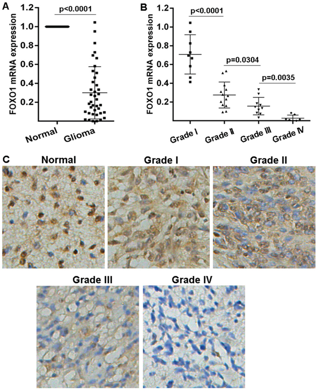 Figure 1: FOXO1 expression pattern in glioma. A. FOXO1 mRNA level in glioma tissue samples represented as fold change were detected with qRT-PCR by normalizing to GAPDH as endogenous control and the expression level in matched non-tumor tissues was set as 1. B. The correlation between FOXO1 mRNA expression and glioma grades was analyzed. C. Representative images of FOXO1 protein level in glioma tissue samples detected by IHC (20×).