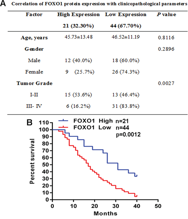 Figure 2: FOXO1 down-regulation is associated with glioma progression. A. The correlation analyses of FOXO1 protein level in relation to clinicopathologic variables of glioma patients. B. Kaplan-Meier analysis estimated the overall survival according to FOXO1 protein level.