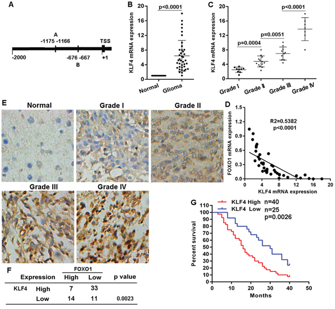 Figure 4: KLF4 negatively correlated with FOXO1 expression in glioma. A. Schematic of the putative binding site of KLF4 in the FOXO1 promoter. B. KLF4 mRNA level in glioma tissue samples represented as fold change were detected with qRT-PCR by normalizing to GAPDH as endogenous control and the expression level in matched non-tumor tissues was set as 1. C. The correlation between KLF4 mRNA expression and glioma grades was analyzed. D. Pearson’s correlation analyses between relative KLF4 mRNA and FOXO1 mRNA levels in glioma tissues. E. Representative images of KLF4 protein level in glioma tissue samples detected by IHC (20×). F. The negative correlation between KLF4 protein and FOXO1 protein level in glioma tissues was analyzed. G. Kaplan-Meier curves showing the overall survival of patients with high or low protein level of KLF4 in their gliomas. Statistical significance was determined by a log-rank test.