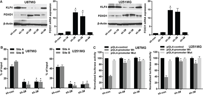 Figure 5: KLF4 transcriptionally represses FOXO1 expression in glioma. A. FOXO1 expression in mRNA and protein levels was detected by qRT-PCR and western blot after KLF4 knockdown. vs control, * p<0.0001. B. ChIP-qPCR for the KLF4 binding to the FOXO1 promoter in KLF4 knockdowned cell lines by transfection of shRNAs. vs control, * p<0.001. C. Luciferase reporter assay for the luciferase activity driven by FOXO1 promoter in U87 or U251 cell lines after KLF4 knockdown. vs control, * p <0.001.