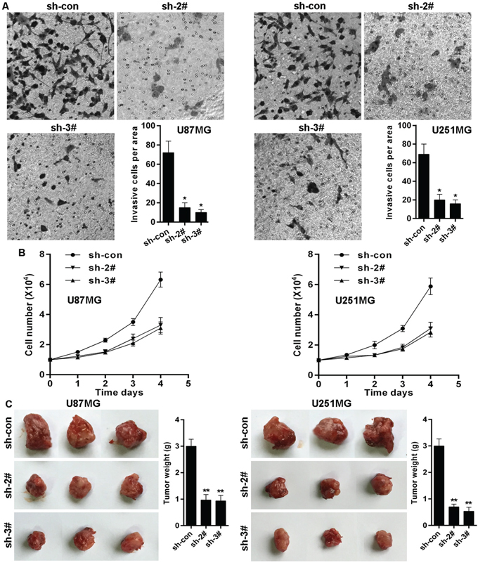 Figure 6: KLF4 knockdown suppresses glioma cells invasion and growth. A. KLF4 knockdown decreased invasion potential of U87 and U251 cell lines, as shown by cell counts per area. B. KLF4 knockdown inhibited proliferation potential of U87 and U251 cell lines in vitro determined cell number count. C. KLF4 knockdown inhibited U87 and U251 cells growth in vivo. Data are represented as a mean ± SD from three mice. vs control, * p<0.001.