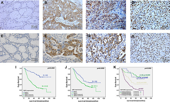 Figure 1: Yes-associated protein 1 (YAP1) and P62 protein expressions in gastric cancer (GC) specimens and paired non-tumor gastric mucosa, and correlation with the prognosis of patients with GC. YAP1 and P62 protein expression was determined by immunohistochemistry (magnification: ×400). Compared with normal gastric mucosa (A), YAP1 expression was significantly up-regulated in moderately differentiated gastric adenocarcinoma (B), poorly differentiated adenocarcinoma (C), and signet ring cell cancer (D). Accordingly, compared with normal gastric mucosa (E), P62 expression was significantly up-regulated in moderately differentiated gastric adenocarcinoma (F), poorly differentiated adenocarcinoma (G), and signet ring cell cancer (H). Kaplan-Meier curves were plotted to determine the cumulative survival rate of patients with GC based on YAP1 and P62 protein expression, and showed that overall survival for patients with YAP1 high-expression was significantly worse than for those with low expression (P < 0.001) (I). Overall survival for patients with P62 high-expression was significantly worse than for those in the P62 low-expression group (P = 0.009) (J). Overall survival for patients with YAP1highP62high indicated the worst prognosis, compare with other three groups (P = 0.005 vs. YAP1highP62low; P < 0.001 vs. YAP1low P62high; P < 0.001 vs. YAP1lowP62low) (K).