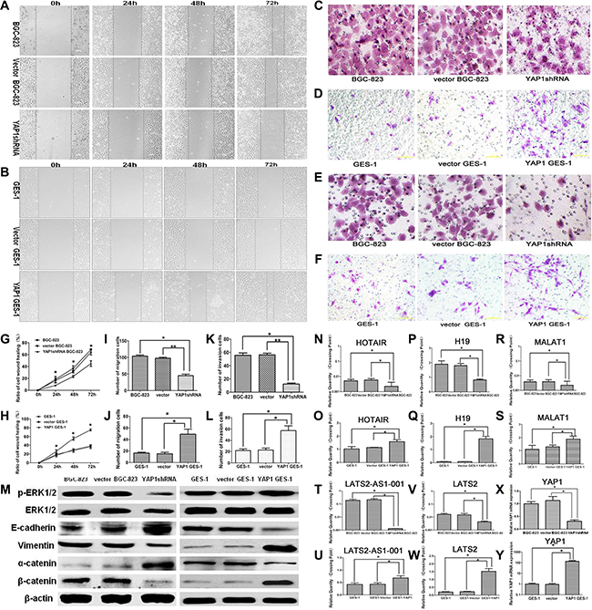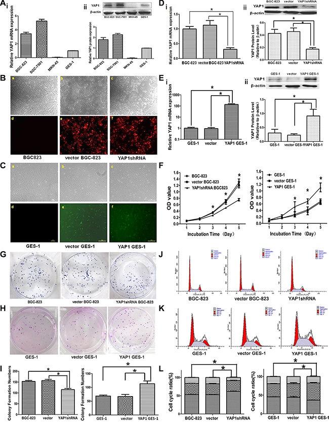 Stable YAP1 shRNA BGC-823 and negative control cells (Vector BGC-823) were selected by puromycin. Stable YAP1 GES-1 and negative control cells (Vector GES-1) were selected by G418. All clones were picked out by fluorescence microscopy (Nikon eclipse Ti-s, Nikon Digital sight DS-U3) and cultured for at least 6 weeks before confirming the expression of YAP1 by qRT-PCR and western blotting.