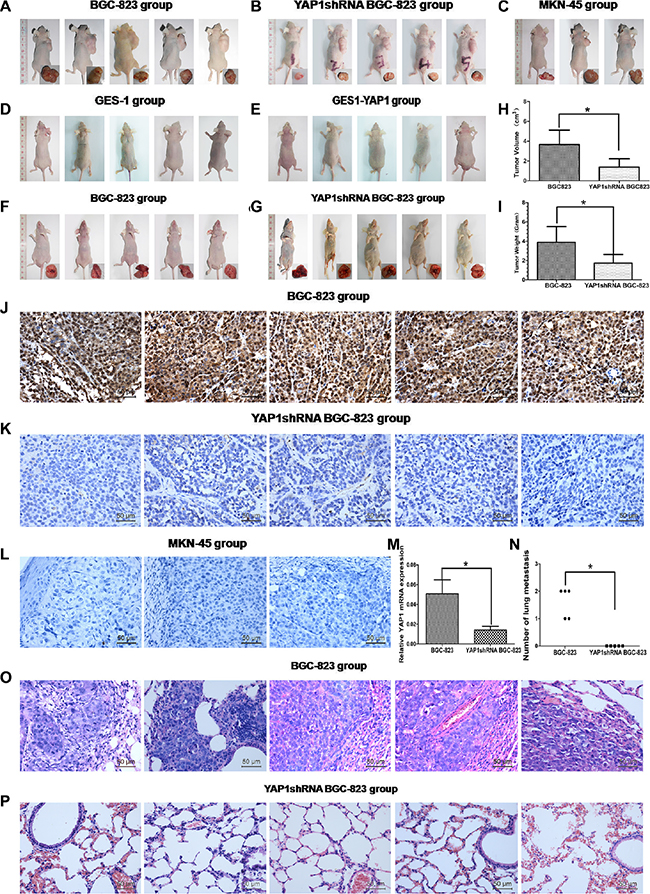 Figure 4: Stable knockdown of YAP1 inhibited xenograft tumor growth and lung metastasis, but YAP1 was not related with tumorigenesis in vivo. BALB/c-nude mice were injected subcutaneously into the right flanks with BGC-823 (A), YAP1-shRNA BGC-823 (B), MKN45 (C), GES-1 (D) and GES-1-YAP1 (E) cells, and let to grow for 4 weeks to establish the heterotopic xenograft tumor mice model. (H) Tumor volume and (I) tumor weight in BGC-823 and YAP1 shRNA BGC-823 groups. YAP1 protein expression was detected by immunohistochemistry (magnification: ×400) in BGC-823 (J), YAP1-shRNA BGC-823 (K) and MKN45 (L) groups. (M) YAP1 mRNA levels in BGC-823 and YAP1 shRNA BGC-823 groups were detected by qRT-PCR. Lung tissues and H&E staining of lung sections (magnification: ×400) in the BALB/c-nude mice hematogenous metastasis models that were harvested from the mice that had been injected in the lateral tail veins with BGC-823 (F, O) and YAP1 shRNA BGC-823 cells (G, P), 8 weeks after inoculation. (N) The numbers of metastatic foci per section of lung of individual mouse was measured after 8 weeks. *P < 0.05.