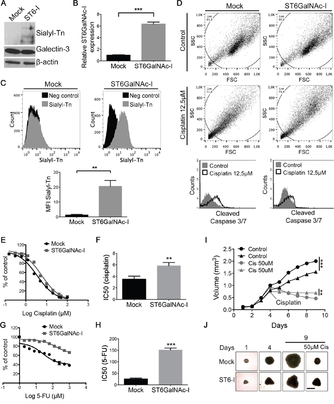 Figure 1: Sialyl-Tn confers chemotherapeutic resistance. A. Immunoblot of sialyl-Tn and galectin-3 in Mock and ST6GalNAc-I-overexpressing cells. β-actin was used as a loading control. B. mRNA levels of ST6GalNAc-I in Mock and ST6GalNAc-I cells. Values were normalized to β-actin. C. Flow cytometry histogram and mean fluorescence intensity (MFI) quantification of sialyl-Tn in Mock and ST6GalNAc-I cells. D. Flow cytometry dot plot and histogram of caspase 3/7 activation in Mock and ST6GalNAc-I-overexpressing cells undergoing apoptosis by treatment with cisplatin (12.5 μM). E-H. SRB assay showing the cells viability under the treatment of (E) cisplatin or (G) 5-FU and determined as a percentage of viable cells relative to control (cells with no drug treatment). F and H. are the average of IC50 values. I and J. (I) Growth curve of Mock (circle) or ST6GalNAc-I-overexpressing (triangle) cells spheroids. Cisplatin (50 μM) was added to spheroid culture and day 4 and the spheroid volume was measured until day 9. (J) Representative images of MKN45 spheroids at day 1, 4 and 9, Bar=400 μm). Data are representative or are the mean ± SEM of three independent experiments, **p < 0.01, ***p < 0.001.