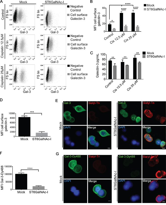 Figure 2: Sialyl-Tn inhibits galectin-3 binding to cellular surface. A and B. (A) Flow cytometry analysis of Mock and ST6GalNAc-I-overexpressing cells stained with anti-galectin-3 antibody after cultured in the presence of cisplatin (12.5 μM and 25μM) and (B) mean fluorescence intensity (MFI) due to galectin-3 staining. C. Quantification by ELISA of galectin-3 in culture supernatants of Mock and ST6GalNAc-I-overexpressing cells treated with cisplatin (12.5 μM and 25 μM, as indicated) for 48h. D. Mean fluorescence intensity (MFI) of cell surface galectin-3 in Mock and ST6GalNAc-I-overexpressing cells. E. Representative immunofluorescence images of Mock and ST6GalNAc-I-overexpressing cells stained with anti-galectin-3 and anti-sialyl-Tn antibodies (Bar=5 μm). F. Mean fluorescence intensity (MFI) of galectin-3-binding sites by using Gal-3Dy488 staining in Mock and ST6GalNAc-I-overexpressing cells. G. Representative immunofluorescence images of Mock and ST6GalNAc-I-overexpressing cells stained with Gal-3-Dy488 and anti-sialyl-Tn antibody (Bar=5 μm). Data are representative of three independent experiments (A, D-G), or are the mean ± SEM (B and C), *p<0.05; **p<0.01; ****p<0.0001. See also Figure S1.