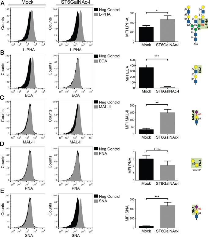 Figure 3: Evaluation of the binding of L-PHA, ECA, MAL-II, PNA and SNA lectins in Mock and ST6GalNAc-I-overexpressing cells. Flow cytometry histograms and mean fluorescence intensity (MFI) of Mock and ST6GalNAc-I-overexpressing cells detected with the biotinylated lectins A. L-PHA, B. ECA, C. MAL-II, D. PNA and E. SNA (grey solid) or with Cy5-conjugated streptavidin alone (filled black). Data are representative images of three independent experiments or are the mean ± SEM, n=3. *p < 0.05, *p < 0.01, ***p < 0.001.