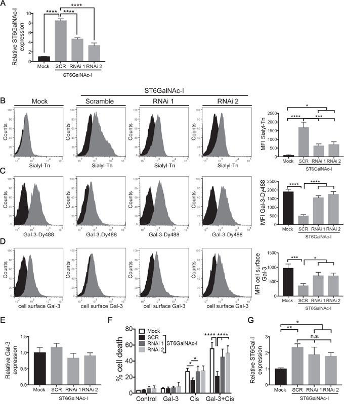 To further establish a role for ST6GalNAc-I in gal-3 binding and cisplatin sensitivity, we treated ST6GalNAc-I-overexpressing cells with two different dsRNA (RNAi 1 and RNAi 2). We observed a reduction of 45% (RNAi 1) and 60% (RNAi 2) in ST6GalNAc-I mRNA levels (Figure 6A) and decreased levels of sTn (63% and 58%, respectively) (Figure 6B) in comparison with scramble-treated cells. We next found that ST6GalNAc-I inhibition restored the levels of gal-3-binding sites (Figure 6C) and cell surface gal-3 (Figure 6D) to the levels found in Mock levels. Consistent with our previous results (Supplementary Figure S1E and S1F), no changes in the total mRNA levels of gal-3 were found in Mock, ST6GalNAc-I-overexpressing and ST6GalNAc-I-knockdown cells (Figure 6E). Additionally, we found that cisplatin treatment (alone or in combination with galectin-3) induced higher mortality rate in ST6GalNAc-I knockdown cells in comparison with scramble-treated cells (Figure 6F). The susceptibility to cisplatin-induced cell death in ST6GalNAc-I knockdown cells was comparable to Mock cells. Finally, we evaluated the mRNA levels of ST6Gal-I enzyme, a N-linked α2-6 sialyltransferase, to rule out its interference in blocking gal-3-binding to the cell surface. Even though the levels of ST6Gal-I mRNA were increased in ST6GalNAc-I-overexpressing cells in comparison to Mock cells (Figure 6G), they were not altered between ST6GalNAc-I knockdown and ST6GalNAc-I-overexpressing cells (Figure 6G). These results demonstrate that knocking down ST6GalNAc-I expression is effective in restoring gal-3-binding, gal-3 cell surface expression and in increasing cisplatin sensitivity in tumor cells.