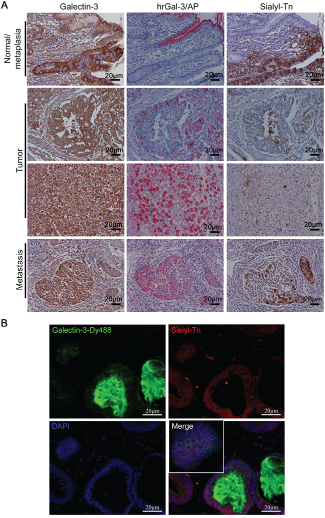 Figure 8: Expression of sialyl-Tn and galectin-3-binding sites in human gastric tumors A. Immunohistochemical staining of galectin-3, galectin-3-binding sites (hrGal-3/AP) and sialyl-Tn in human gastric tissue samples. B. Immunofluorescence of gastric tumor samples with galectin-3-Dy488, sialyl-Tn and DAPI staining. (A and B) Representative images are shown, bar=20 μm. See also Figure S5.