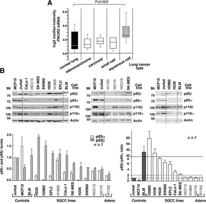 The PI3K p85 regulatory subunit binds, stabilizes and induces activation of the p110 catalytic subunit [27]. Normal cells express higher levels of PIK3R1 (which encodes p85α) than of PIK3R2 (p85β) [24, 28, 29]; in contrast, metastatic melanoma, invasive breast cancer and advanced colon carcinoma show a marked increase in PIK3R2 expression, which correlates with tumor grade [24, 25]. Analysis of gene expression data shows that PIK3R2 expression is also frequently enhanced in lung SQCC (Figure 1A) [www.oncomine.org, Ref. 30][also Ref. 31–33].