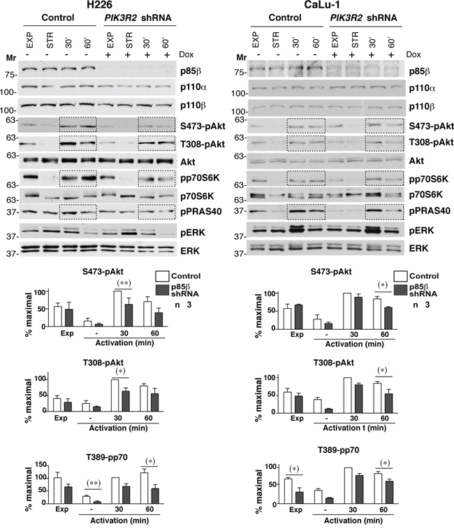 Figure 2: PIK3R2 depletion reduces PI3K pathway activity in CaLu-1 and H226 lung SQCC cell lines. CaLu-1 or H226 cells expressing inducible PIK3R2 shRNA were cultured alone or with doxycycline (2 μg/ml, 72 h); extracts were examined in WB. Mr indicates relative mobility. Graphs show the percent of maximal S472-pAkt, T308-pAkt and T389-pp70S6K signal, normalized to Akt or p70S6K and compared to the control cell signal at 30 min post-stimulation, considered 100%. * P<0.05; ** P<0.01; Student’s t test.