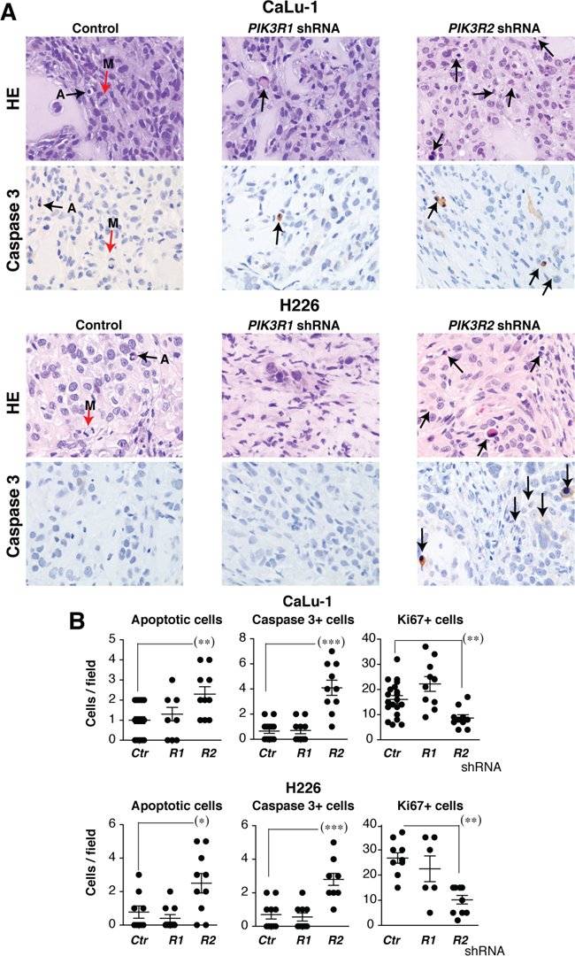 To examine the effect of reducing PIK3R2 levels at a cellular level, we prepared a set of xenografts from H226 and CaLu-1 cells and mice were sacrificed at experiment midterm, when the tumor size began to diminish. Histological examination of these tumor samples showed a low mitotic index (Figure 5, red arrows), which was even lower after PIK3R2 depletion. Few apoptotic figures were observed in control or PIK3R1 shRNA-treated tumors, and were numerous in PIK3R2-depleted tumors (Figure 5). Immunostaining of Ki-67+ and active caspase 3 in control, PIK3R1 and PIK3R2 shRNA-treated samples showed a lower number of dividing cells and a larger number of apoptotic cells after PIK3R2 shRNA treatment (Figure 5). These results indicate that PIK3R2 depletion in SQCC lines decelerates cell growth and induces cell death.