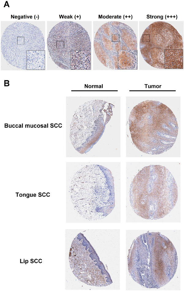 Figure 1: IHC staining of DDX60 protein expression. A. The representative immunoreactivity intensity of DDX60 in OSCC for negative (-), weak (+), moderate (++), strong (+++) staining. B. The representative immunoreactivity of paired tumor and normal tissues in buccal mucosal, tongue, and lip subsites.