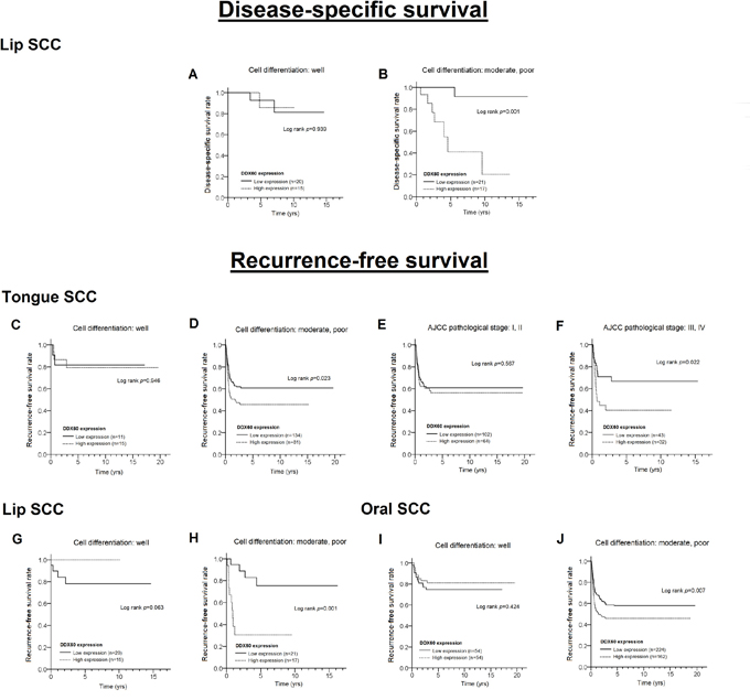 Figure 3: Differences in the survival curves between patients with high and low levels of DDX60 expression in LSCC (A, B for DSS; G, H for RFS), TSCC (C-F for RFS), and OSCC (I, J for RFS), stratified according to cell differentiation and the pathological stage.