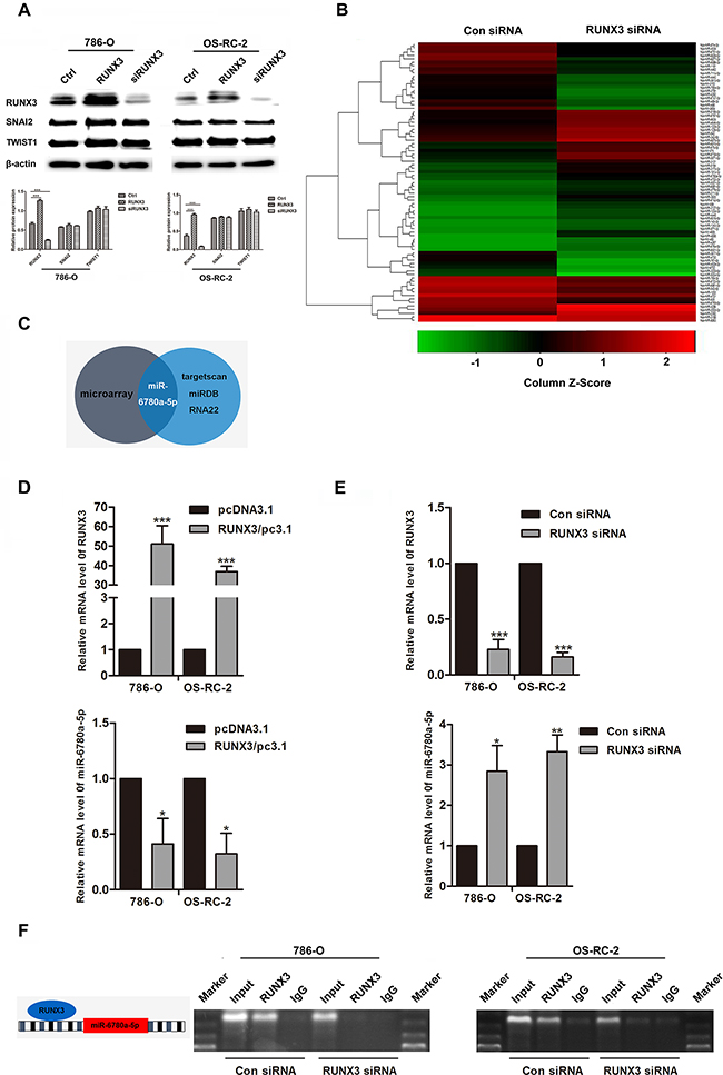 Figure 4: RUNX3 negatively regulated miR-6780a-5p expression in renal carcinoma cells.Western blotting for RUNX3, SNAI2 and TWIST1 in 786-O and OS-RC-2 cells from the Ctrl, RUNX3/pc3.1 and siRUNX3 groups A. SNAI2 and TWIST1 expression were unchanged. Heat map showing differentially regulated miRNAs in 786-O cells infected with control or RUNX3 siRNA B. Schema for identification of putative miRNA(s) that could be activated by RUNX3 knockdown and were partly complementary to a conserved site within the E-cadherin 3’ UTR C. qRT-PCR analysis of RUNX3 and miR-6780a-5p levels in 786-O and OS-RC-2 cells transfected with RUNX3 overexpression plasmid or RUNX3 siRNA D & E. Data were means ±SD (*P<0.05, **P<0.01, ***P<0.001) from three experiments. Diagram of the miR-6780a-5p promoter and RUNX3 binding sites (left) ChIP analysis in 786-O and OS-RC-2 cells 48 h after infection with control siRNA or RUNX3 siRNA F.