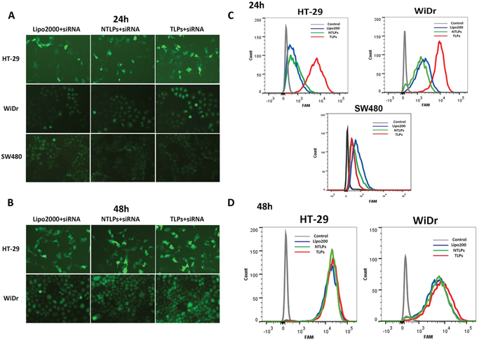 Figure 2: Uptake of siRNA liposomal complexes in colon cancer cells. A and B. Fluorescent micrographs of HT-29, WiDr and SW480 cells transfected with FAM-siRNA loaded Lipo2000, NLPs and TLPs with the final siRNA concentration of 100 nM at 24 and 48 hours post transfection. C and D. Cellular uptake of siRNA were also evaluated by flowcytometry.
